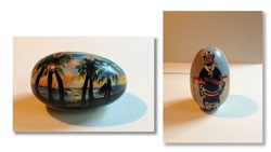 I've always enjoyed the challenge of capturing special moments in time and place using a variety of mediums such as watercolors, embroidery or rug hooking. The wooden Easter eggs capture a special moment in the lives of my family, which includes two athletic grandsons.